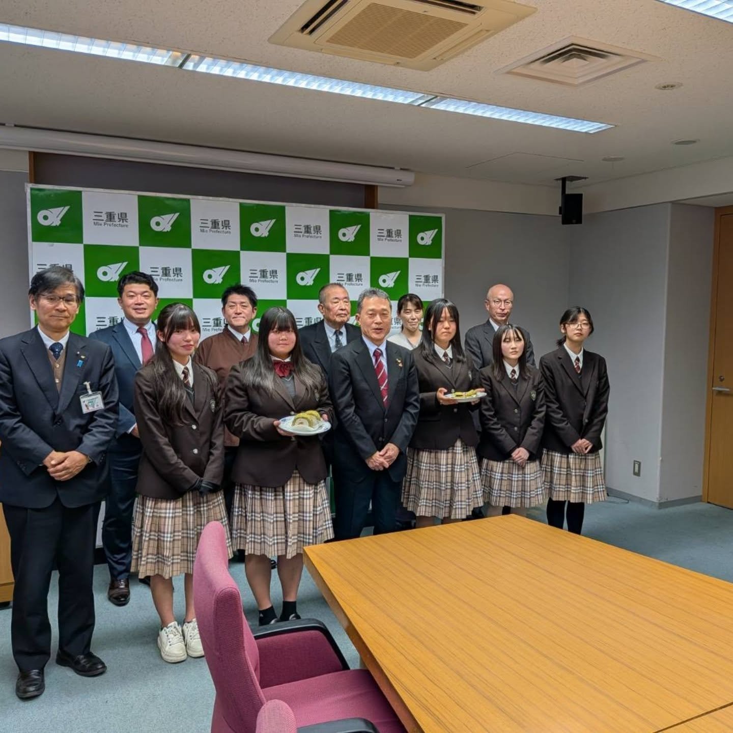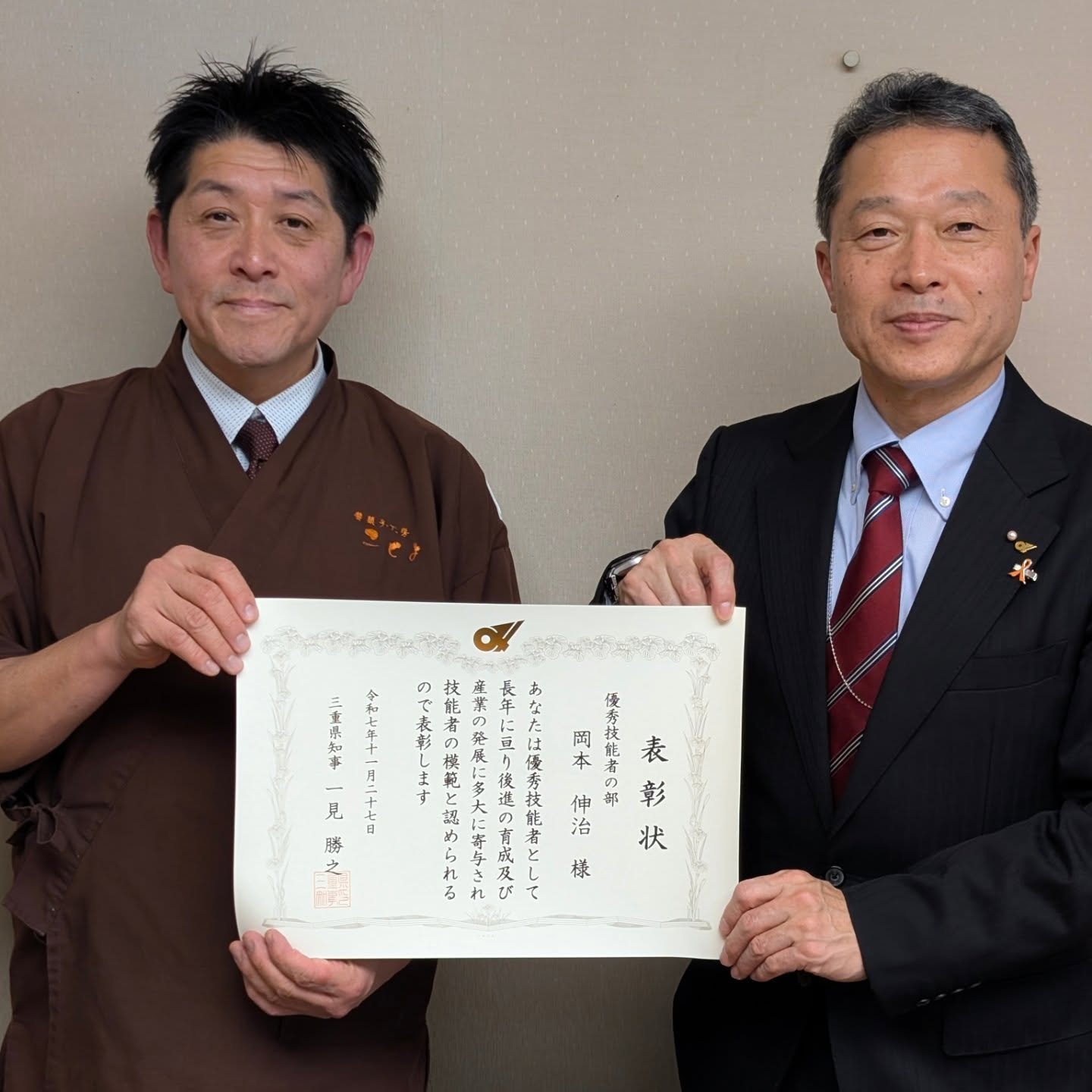 一見三重県知事から令和7年度の三重県技能者(三重の名工)を受賞。10月におこなわれた三重県高校生スイーツコンテストの優勝、準優勝報告会で三重県庁。優勝の三重県知事賞、準優勝の三重県教育委員会賞を明野高校の2チームが受賞。2025年12月25日